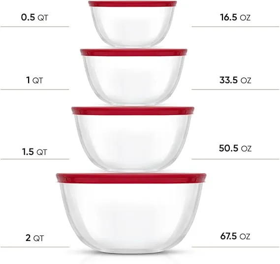 - 8pc Glass Mixing Bowls With Lids Set: The 2qt bowl is 8in wide and 4.25in tall while the next big bowl is 7.5x4in. Two med / small glass bowls include 6.25x3in and 5.5×2.5in. From large bowl to small glass bowl each one nests into the other with the lids on, so nothing gets lost in your cupboard.